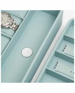 - Design details: vegan leather; Our smart storage solutions for Apple Watches and smart watches deliver high-tech performance along with quality craftsmanship. The aqua 6-piece Watch Box w/ Strap Tray for Apple Watches keeps your analog, Apple Watches & Apple watch straps in a centralized location. Features 5 compartments for traditional watches, 6 watch strap compartments as well as an Apple Watch charging station for your cable and puck. Magnetic charging cable not included.