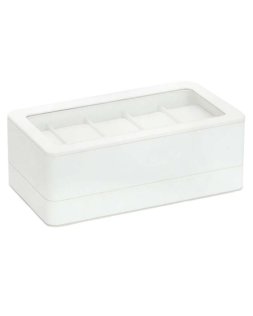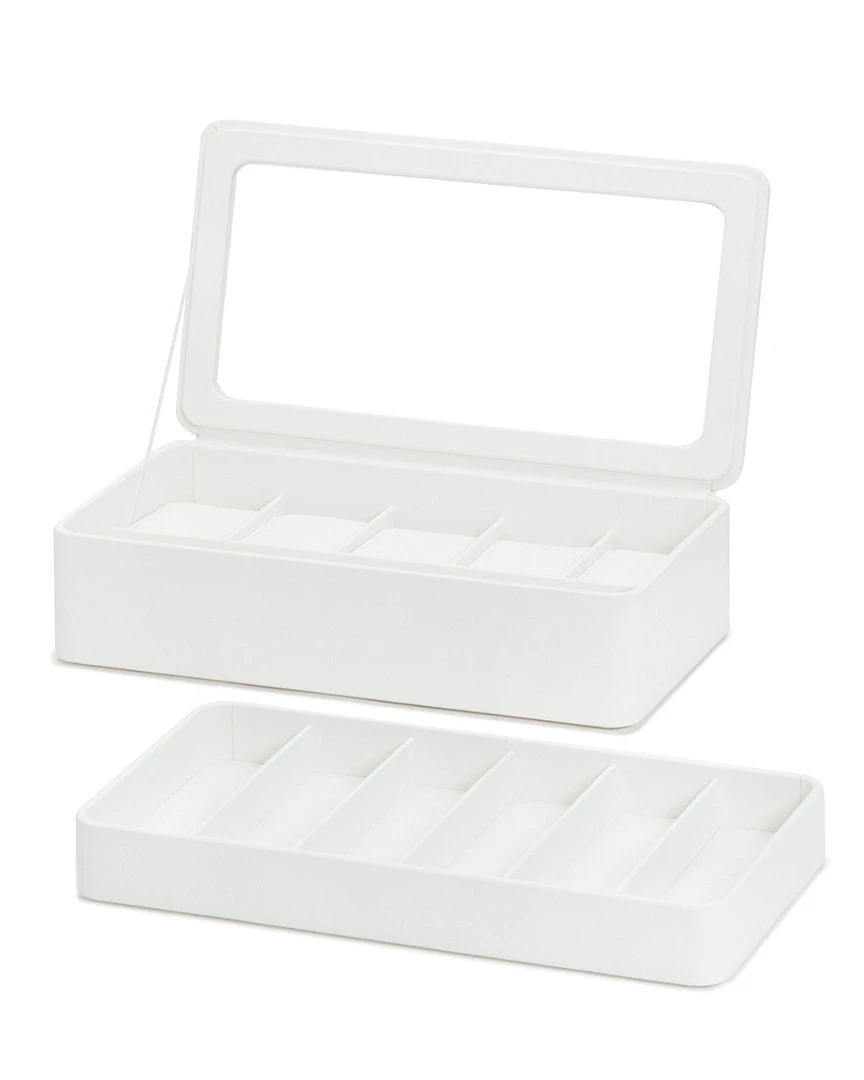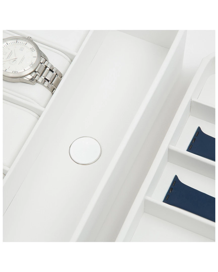 - Design details: vegan leather; Our smart storage solutions for Apple Watches and smart watches deliver high-tech performance along with quality craftsmanship. The white 6-piece Watch Box w/ Strap Tray for Apple Watches keeps your analog, Apple Watches & Apple watch straps in a centralized location. Features 5 compartments for traditional watches, 6 watch strap compartments as well as an Apple Watch charging station for your cable and puck. Magnetic charging cable not included.