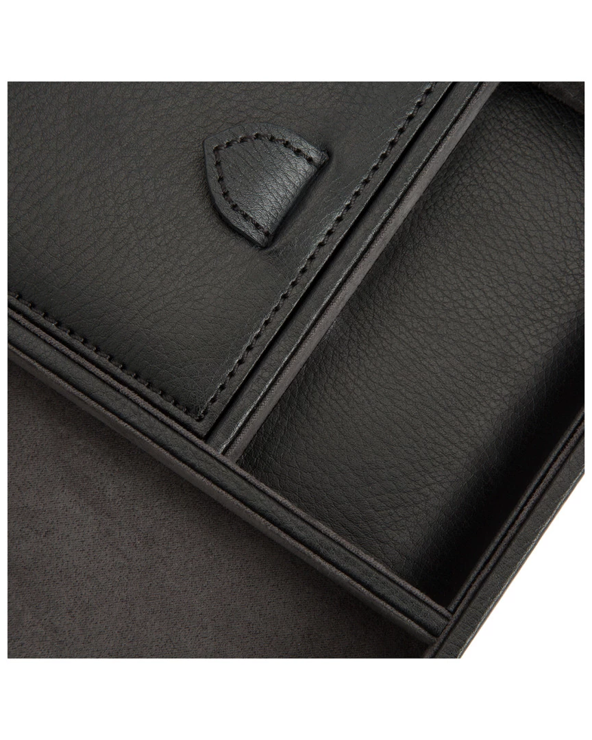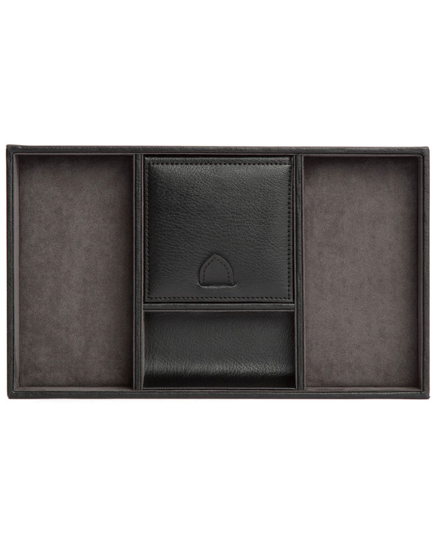 - Design details: Stylish and classic, Blake is brought to life with top grain leathers, chrome and bold accents. This sleek black leather Blake valet tray effortlessly organizes your electronics, money, jewelry, keys, and more. Includes grey ultrasuede lining and 4 storage compartments; Storage: 4 storage compartments (1 with lid)