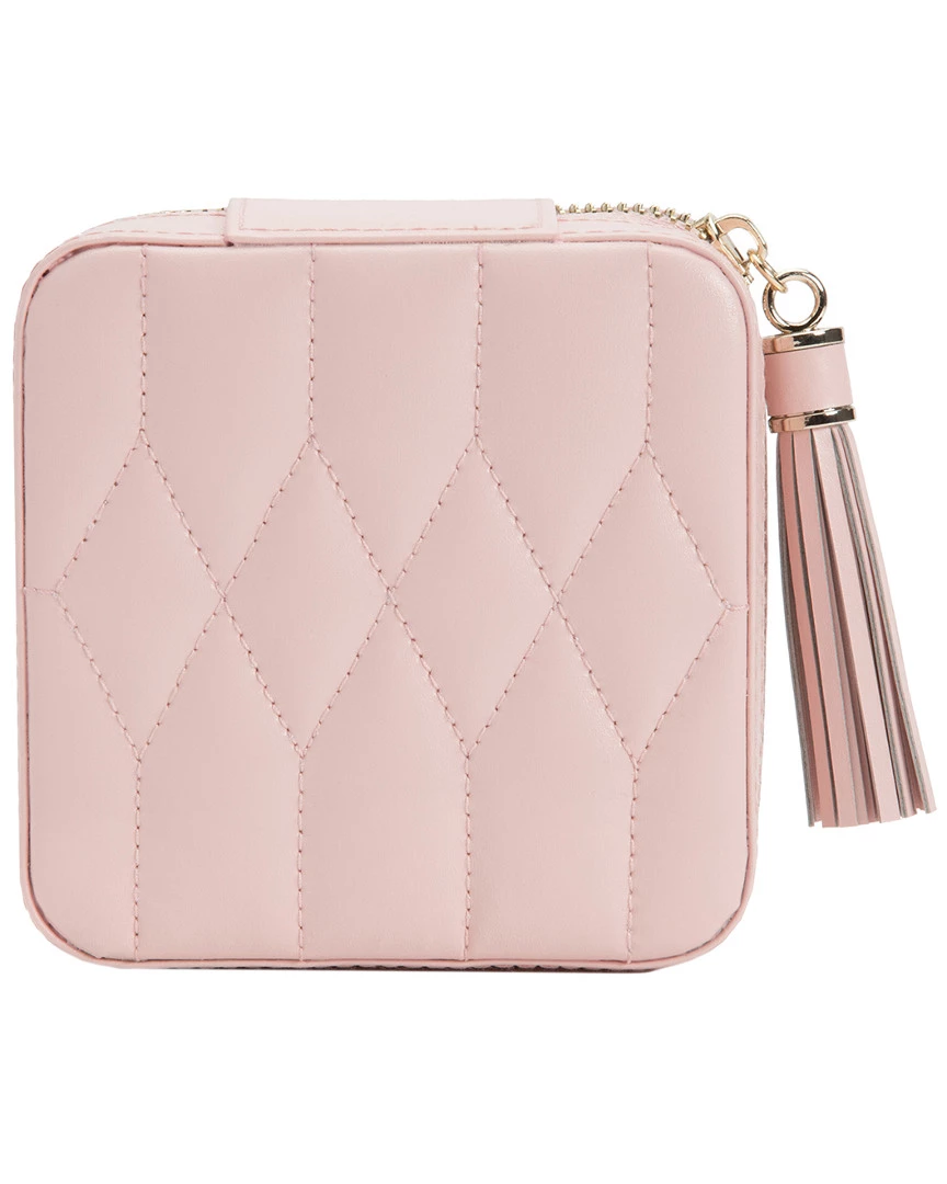 - Design details: The embodiment of sophistication and style. Caroline, a timeless classic with elegant soft lines of the 50s, supple diamond quilted leather accented with gold hardware. This refined rose quartz zip travel case is the perfect home for your precious jewelry and heirlooms. Traveling with Caroline makes safekeeping your jewelry whilst on the go a snap. ; Storage: 7 ring rolls, 4 compartments and 3 necklace hooks with pocket