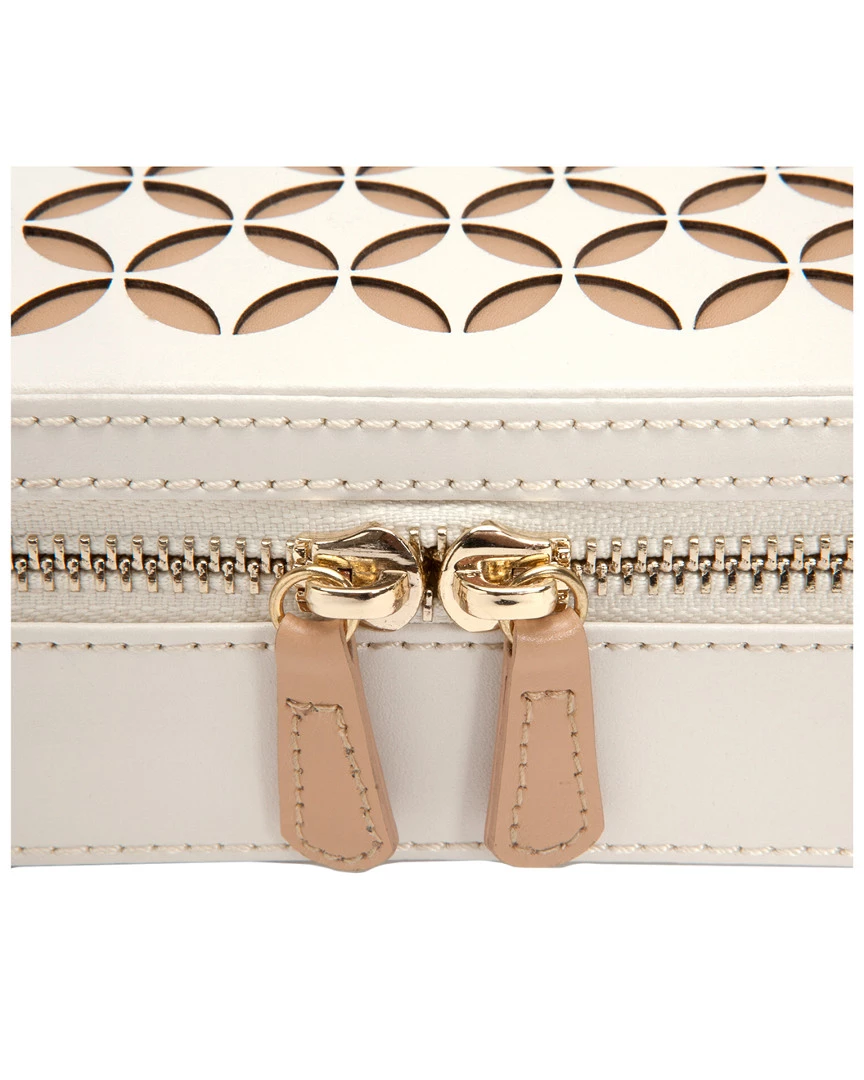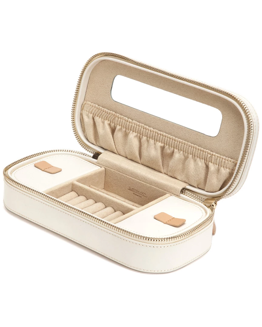 - Design details: Cream laser cut leather in intricate design, Chloe reflects the romantic and thoughtful you. Perfect proportions allow you to safely organize your jewelry on-the-go. Includes cream leather, mirror, gold finished hardware, and patented LusterLoc lining to absorb the hostile gases known to cause tarnishing for up to 35 years. ; Storage: 6 ring rolls, 6 earring holes and 4 storage compartments