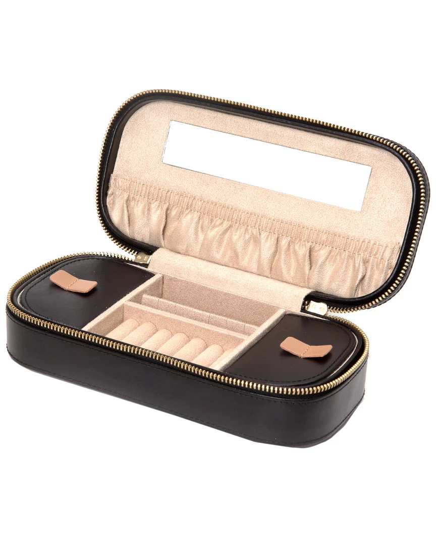 - Design details: Black laser cut leather in intricate design, Chloe reflects the romantic and thoughtful you. Perfect proportions allow you to safely organize your jewelry on-the-go. Includes cream leather, mirror, gold finished hardware, and patented LusterLoc lining to absorb the hostile gases known to cause tarnishing for up to 35 years. ; Storage: 6 ring rolls, 6 earring holes and 4 storage compartments