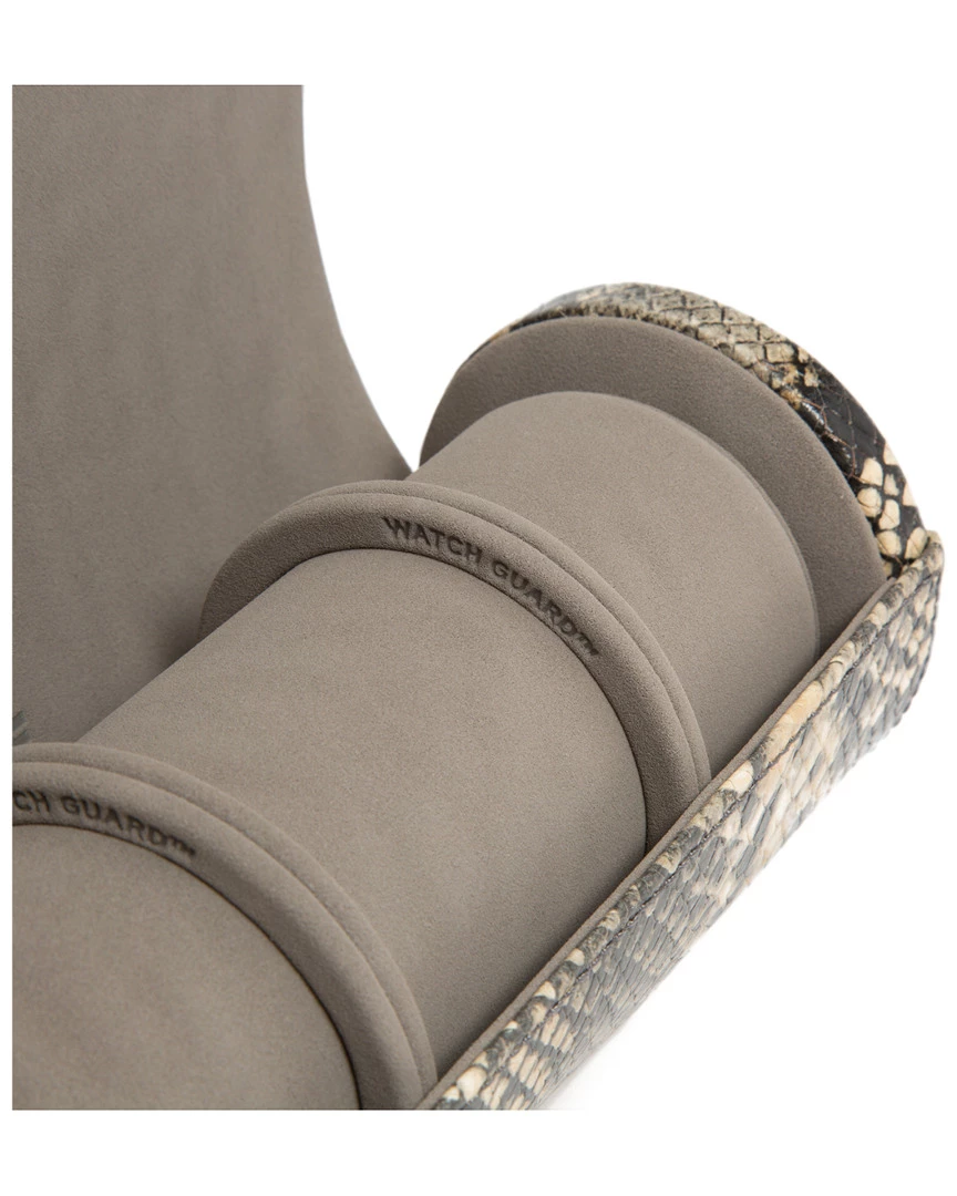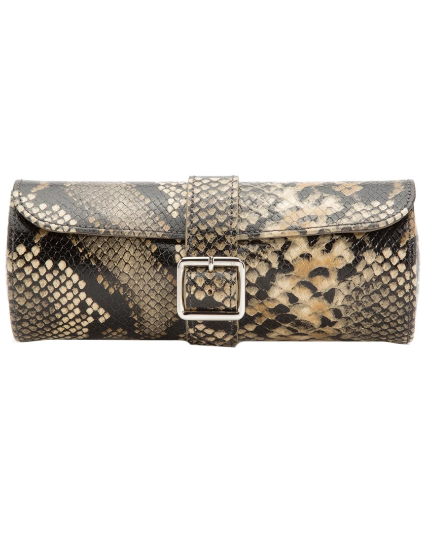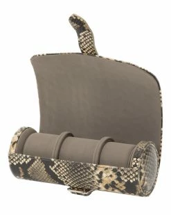 - Design details: Lose yourself in the beauty of tan python embossed top grain cowhide leathers and over five generations of handmade tradition. Securely pack your timepieces and be prepared for any occasion thrown your way. Includes space for one watch, mink microfiber lining and a chrome buckle closure; Storage: Holds 3 watches