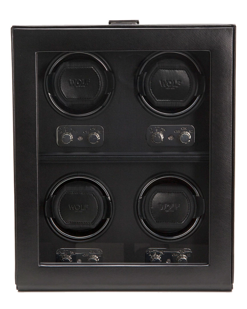 - Design details: The Heritage Men’s collection offers functional, classically designed pieces for your everyday use. This winder includes 4 winding modules, latch closure, glass cover, chrome finished hardware, black smooth vegan leather and satin lining; Patented Innovation – Every WOLF winder counts the precise number of rotations. All other winder estimate the number of rotations.