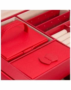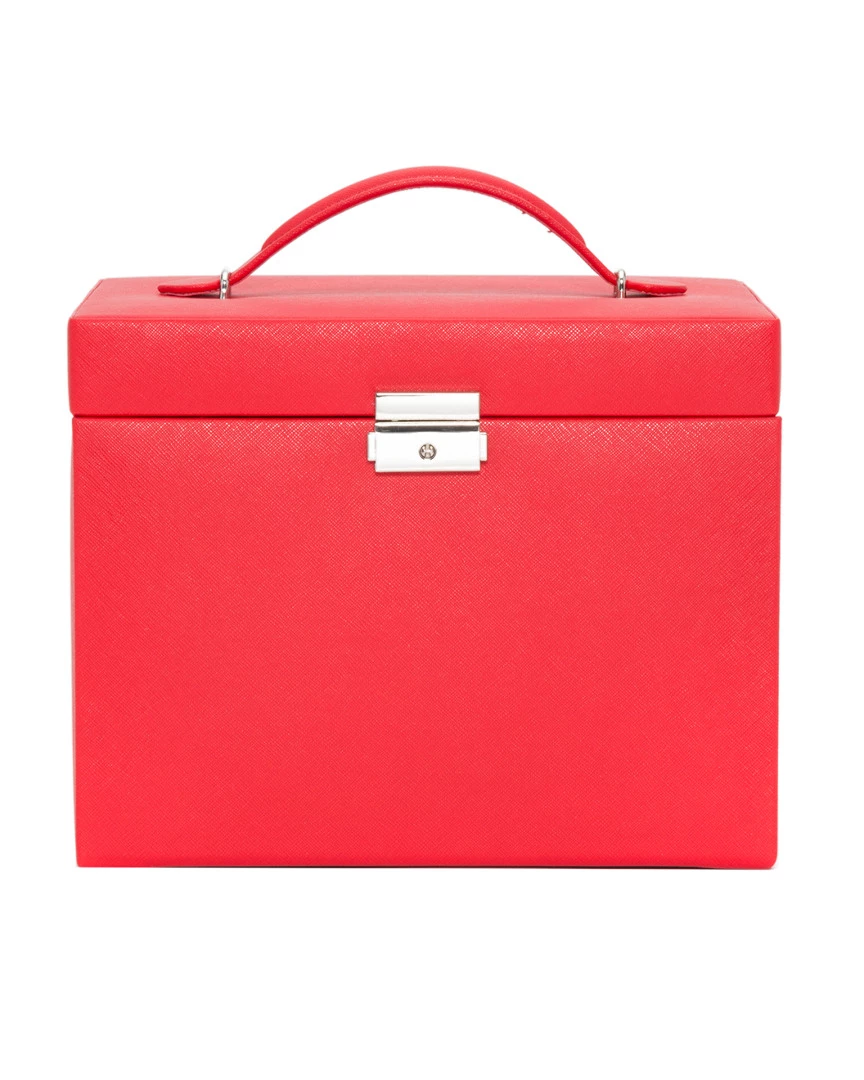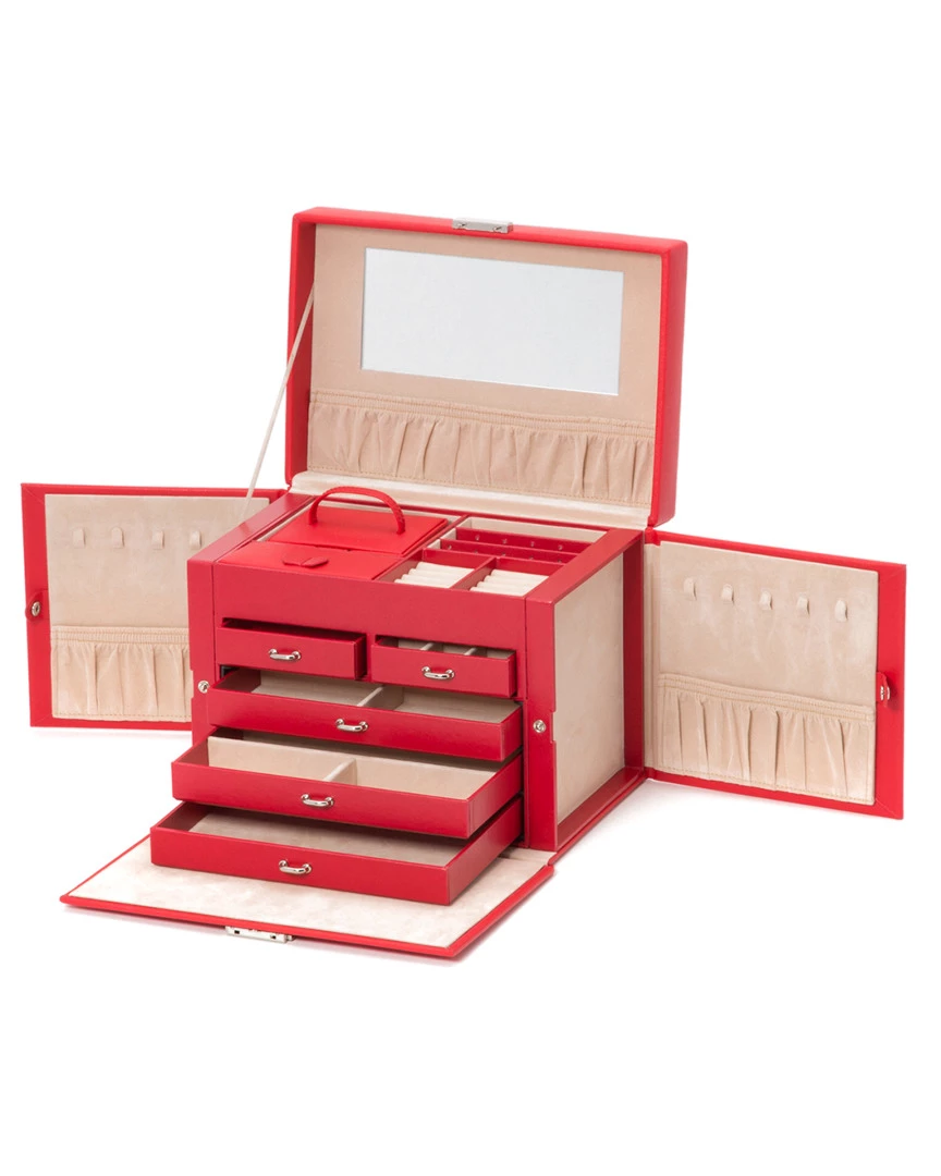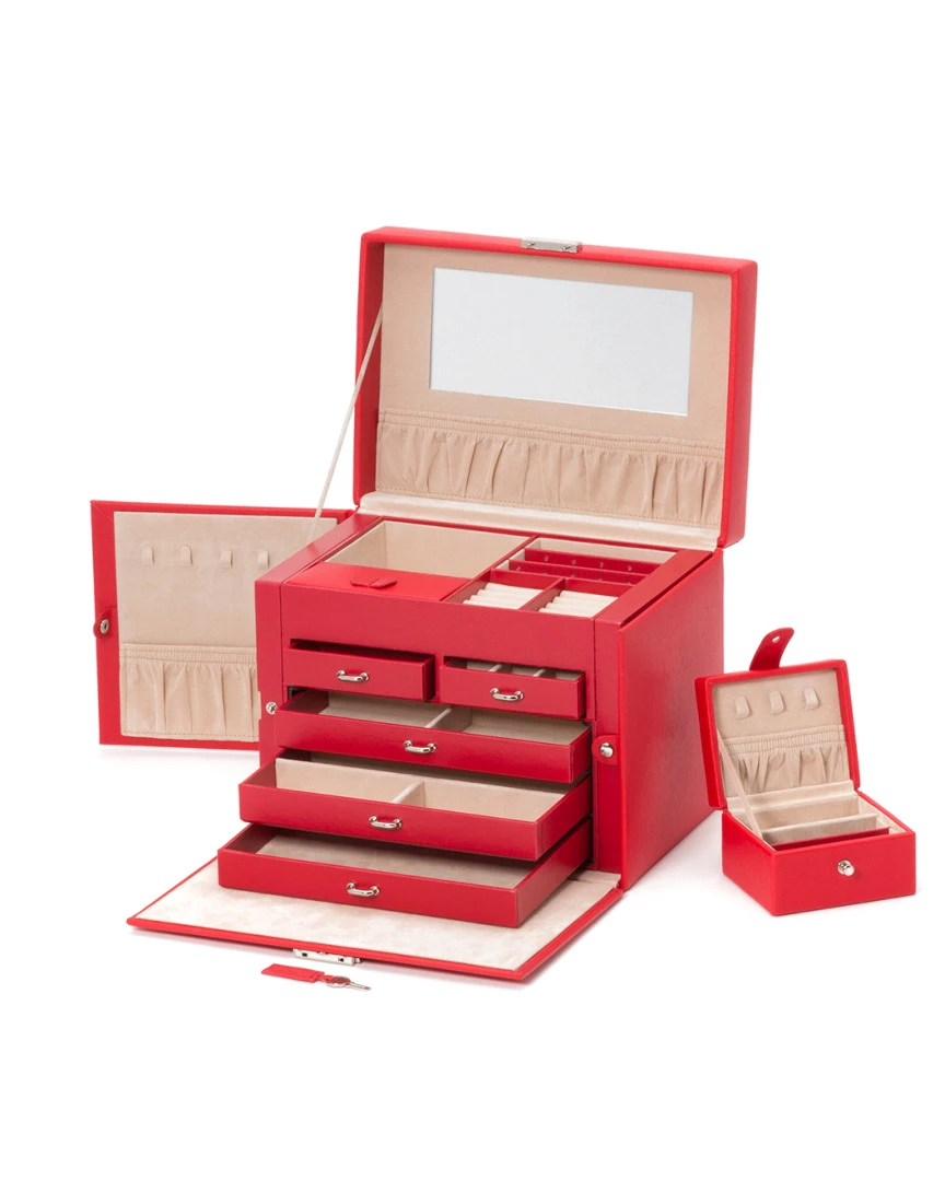 - Design details: Chelsea jewelry case, a classic style combined with functional design. Includes lock & key, 28 jewelry compartments, 10 ring rolls, 20 earring holes, 10 necklace compartments, travel case (2 jewelry compartments, 8 earring holes, 1 ring roll, and 3 necklace hooks), glass mirror, gold finished hardware, red vegan leather and ultra-suede lining;