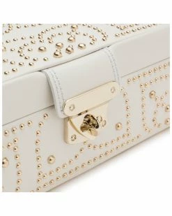 - Showcasing an intricate studded mosaic design, the Marrakesh collection features carefully applied gold studs. Includes cream leather, mirror, gold finished hardware, LusterLoc anti-tarnish lining, 3 ring rolls and 7 storage compartments and travel case (1 ring roll and 1 compartment).