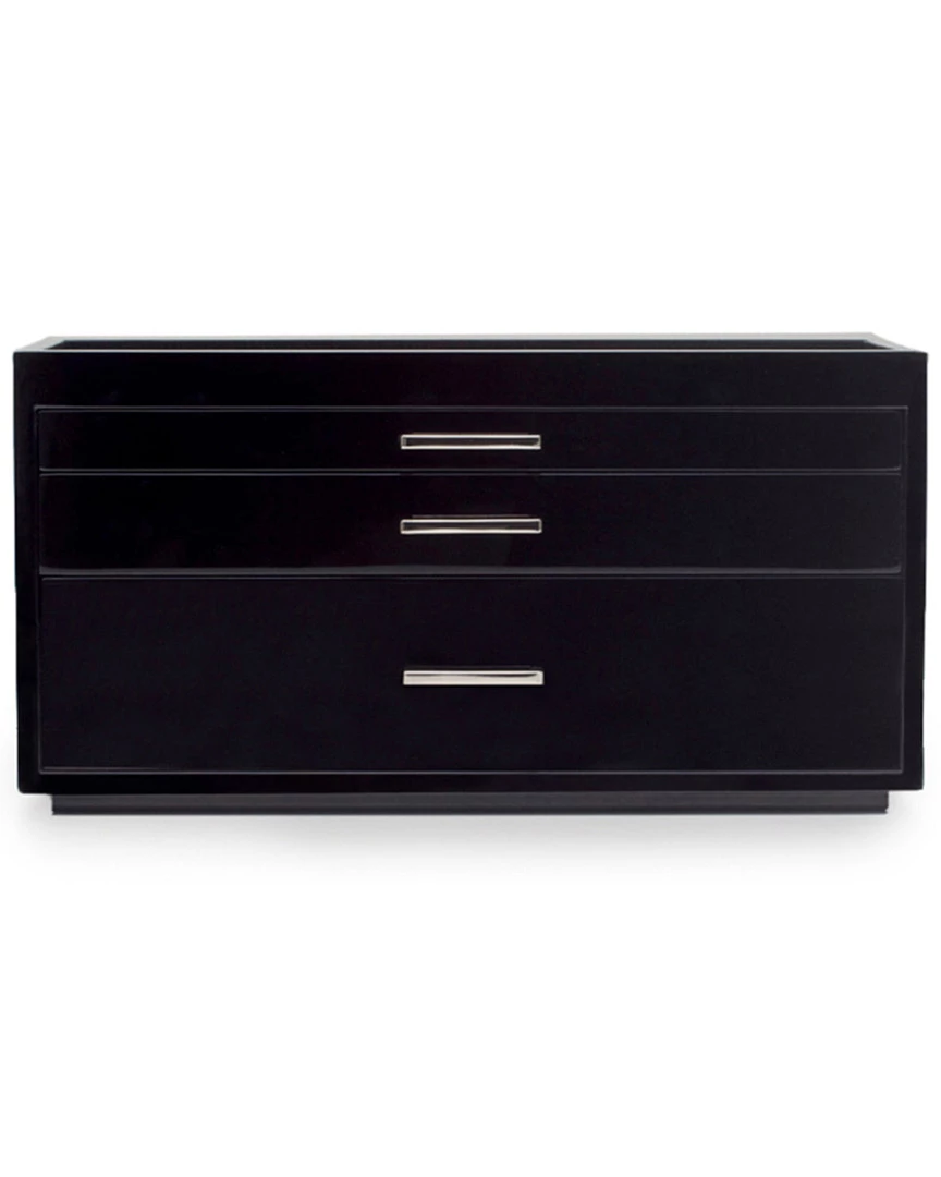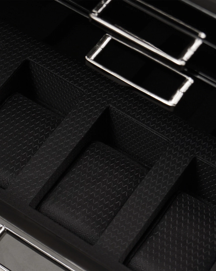 - Design details: High gloss piano finished woods encase our collection of boxes and valets. The refined and simple lines of Meridian remind us that simplicity is sometimes best. This highly polished black watch box is hand crafted to completely customize your accessory storage through a unique modular system. Includes 5-piece watch storage, 3 storage compartments, gold finished hardware, recessed top tray, black textured silk, high gloss finish and wooden frame; Storage: 5 piece watch storage (cuff will accommodate up to 52mm case), 3 compartments, recessed top tray