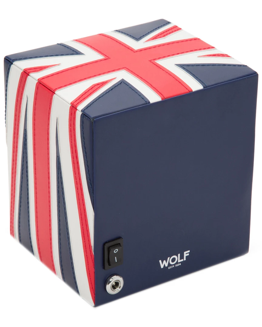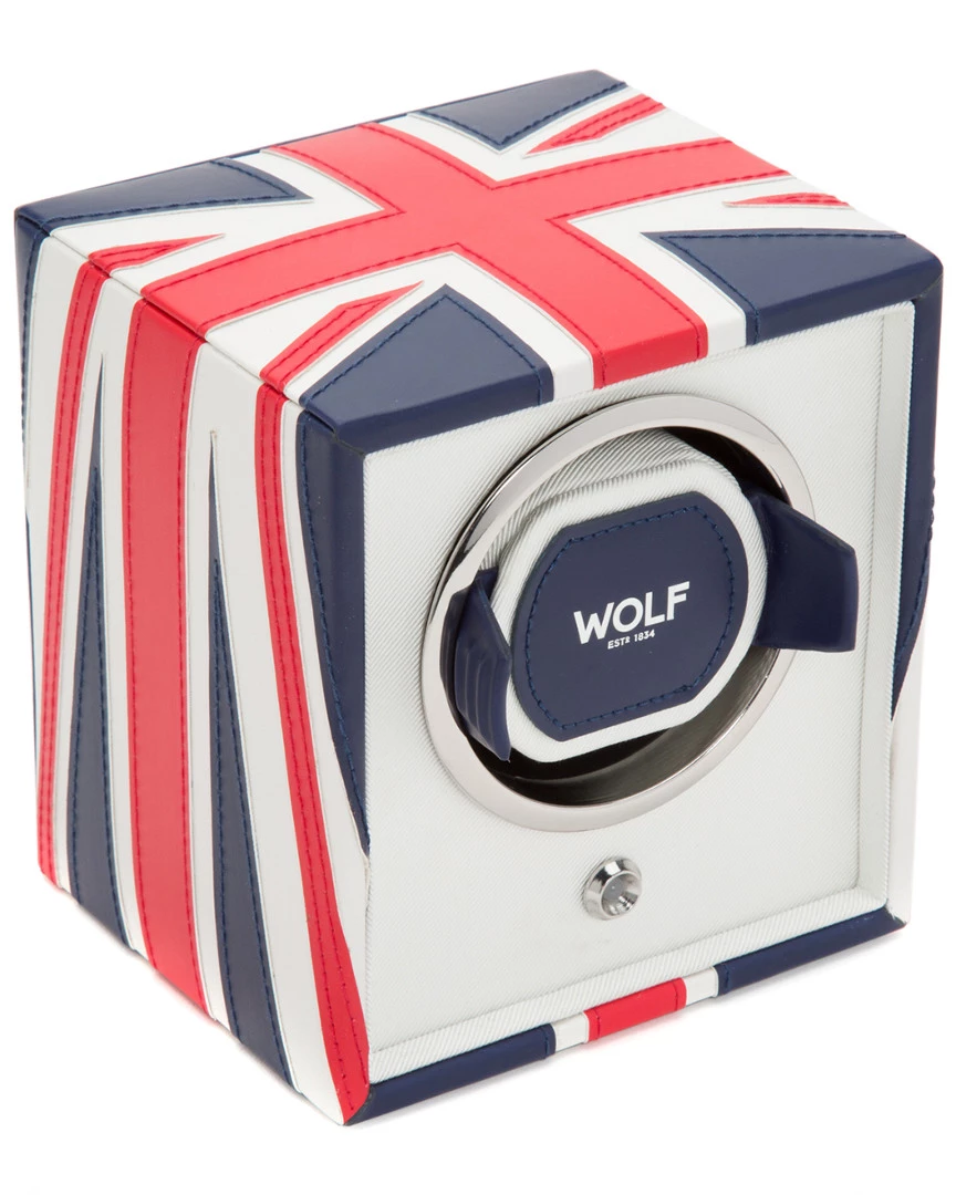 - Design details: Drawing inspiration from the worlds great destinations, show your patriotism with the Union Jack Navigator Cub watch winder. The single winder features chrome finished hardware and winds your watch perfectly by counting turns per day. Journey the world and always be on time; Patented Innovation – Every WOLF winder counts the precise number of rotations. All other winder estimate the number of rotations.