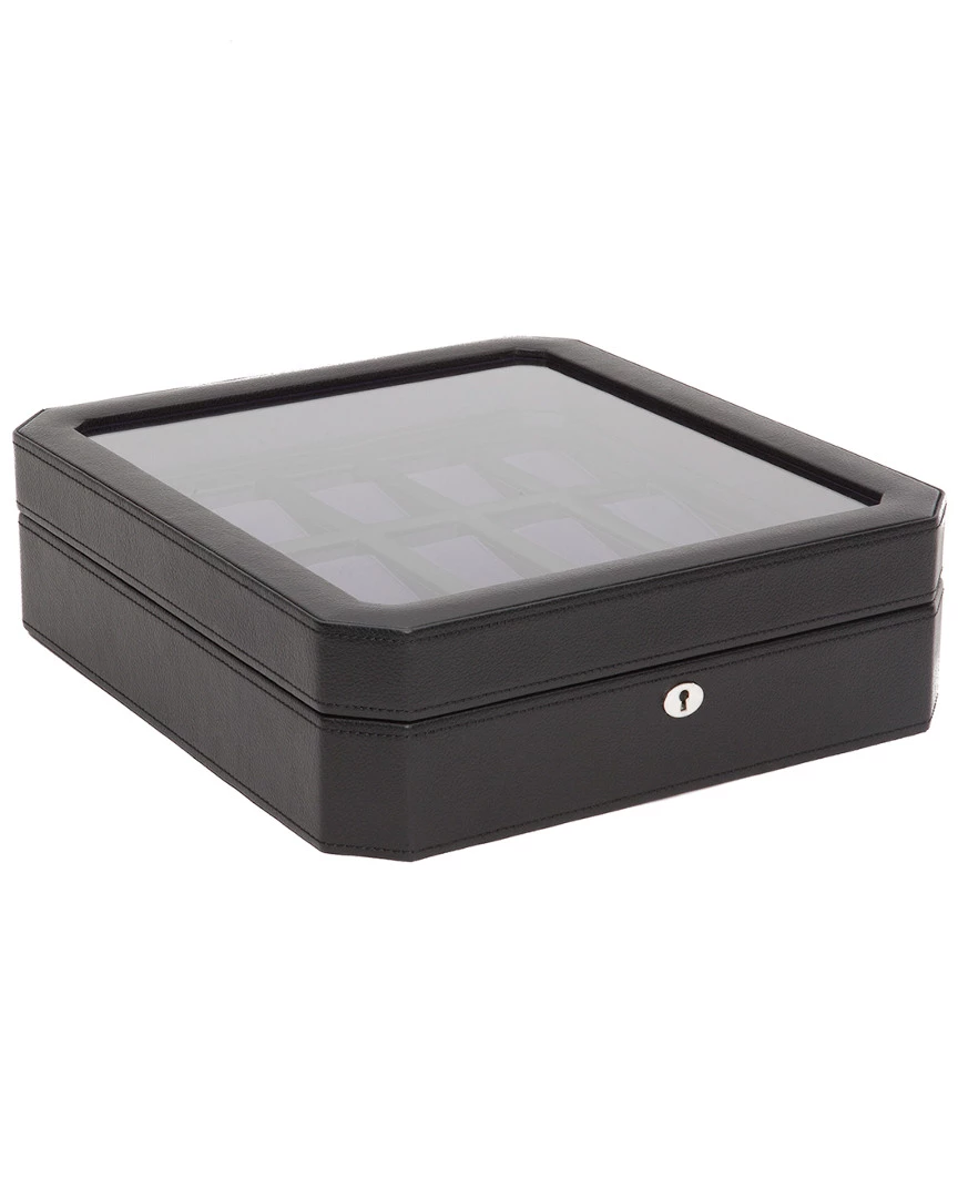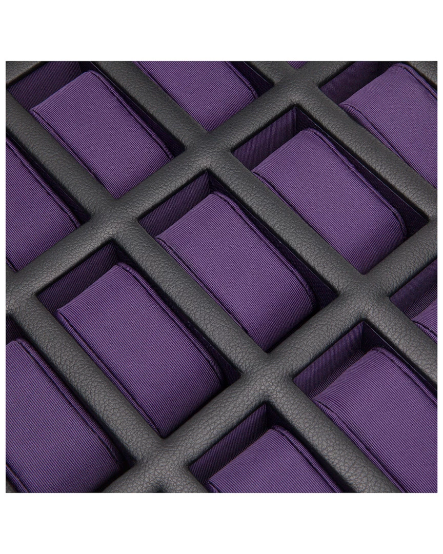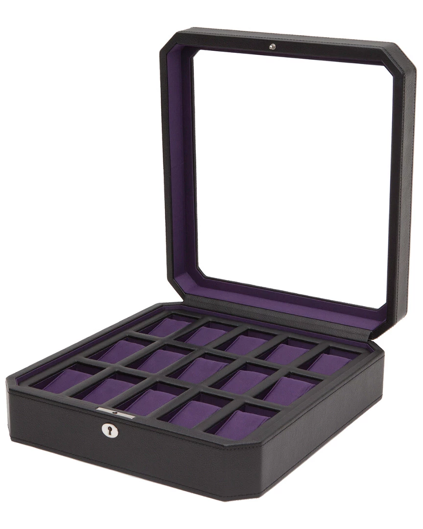 - Design details: Retro shapes and colors make Windsor a perfect companion for your timepieces. Display and organize your collection beautifully with the Windsor 15-piece watch box. Features chrome finished hardware, locking glass cover, smooth black vegan leather, purple textured silk lining and 15-piece watch storage; Storage: 15 piece watch storage (cuff will accommodate up to 52mm case)
